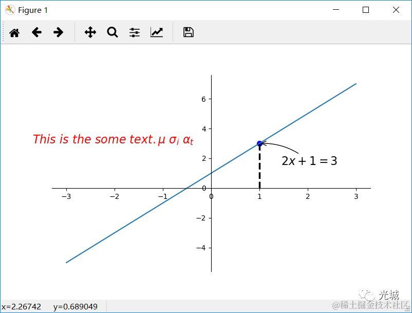 plt.annotate(r'$2x+1=%s$'%y0,xy=(x0,y0),xycoords='data',xytext=(+30,-30),textcoords='offset points',fontsize=16,arrowprops=dict(arrowstyle='->',connectionstyle='arc3,rad=.2'))