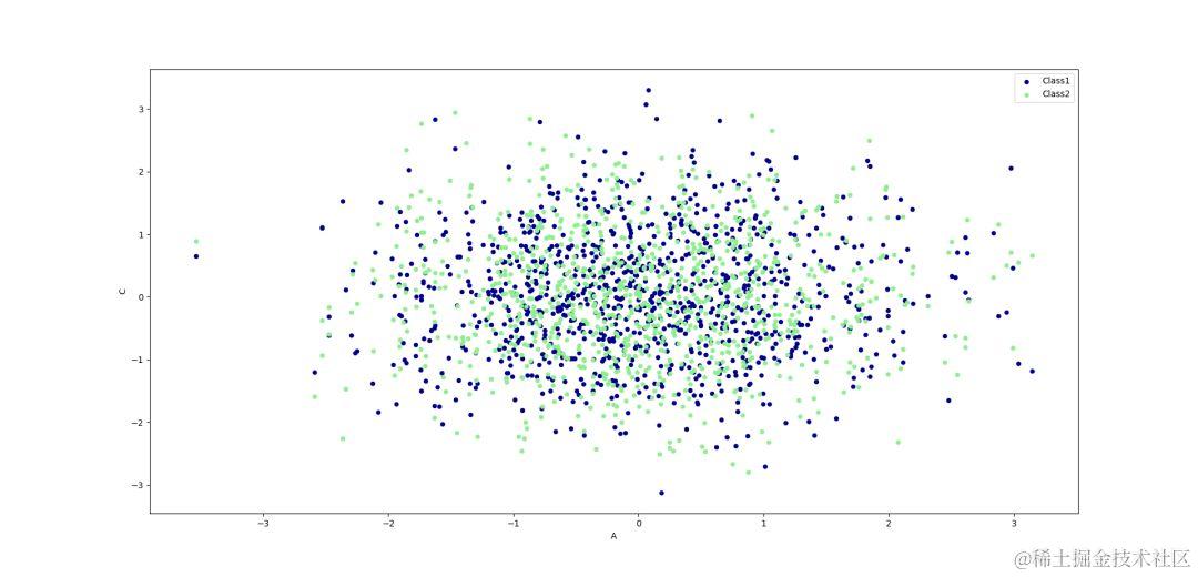 data.plot.scatter(x='A',y='C',color='LightGreen',label='Class2',ax=ax)