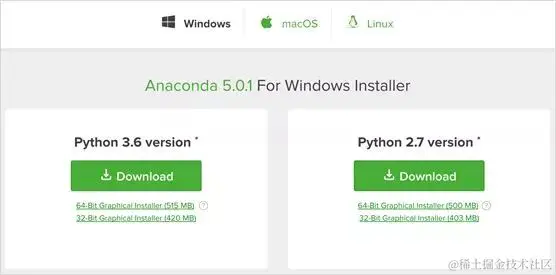 根据你的电脑系统,选择相应版本的 Anaconda(记住选择 Python 3.6或者3.7 的版本),Mac OS 用户选择 Mac 版本即可,如果不想麻烦,请选择 Graphical Installer。