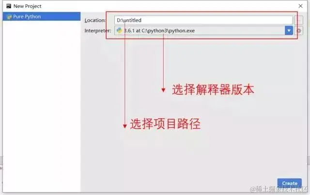左侧导航栏选择 Pure Python ,右侧的 Location 选择项目的路径, Interpreter 通过下拉栏选择 Python版本 ,这里直接使用 Python 的安装路径即可。