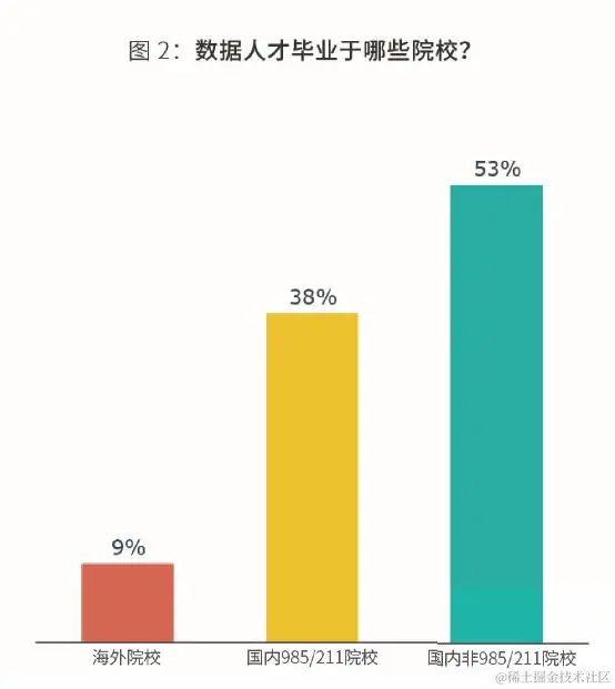 调查显示,头部数据人才来源更优,有35%的头部数据人才拥有硕士及以上学历,同时有50%的头部数据人才来源于985/211高校。
