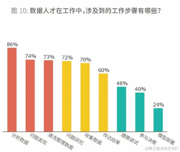 从数据人才在工作中的步骤来看,大部分工作中都涉及基础步骤,而随着步骤本身的复杂程度提高,工作中涉及到这些步骤的人的比例也有了显著的下降。调研结果显示,在工作中,越复杂的步骤使用的人越少,这从侧面也为数据人才提升自身竞争力提供了明确的方向。