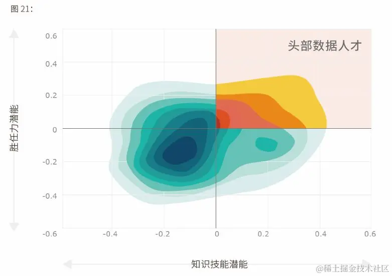 头部数据人才:以知识技能(硬实力)为横轴,以胜任力潜能为纵轴(软实力),原点以两个指数各自的均值,得到数据人才评估的坐标系,落在第一象限的即为头部数据人才。即头部数据人才的软硬实力皆高于均值。调查显示,头部数据人才约占22%。