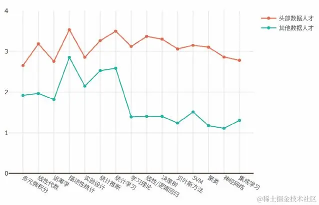 对比发现,在数学与统计分析和机器学习相关知识技能方面,头部人才均值都要优于其他数据人才,但同时我们可以看到,两者之间的差距在机器学习领域表现更为突出。