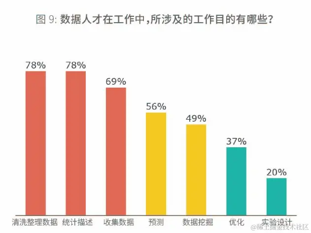 调研结果表明,数据工作者最常用的数据科学方法是线性回归、逻辑回归以及决策树,这三种方法也是数据分析学科中最经典的模型,也是数据人才在解决问题的过程中首选的方法。这表明,数据人才的知识门槛并非想象的那么高。