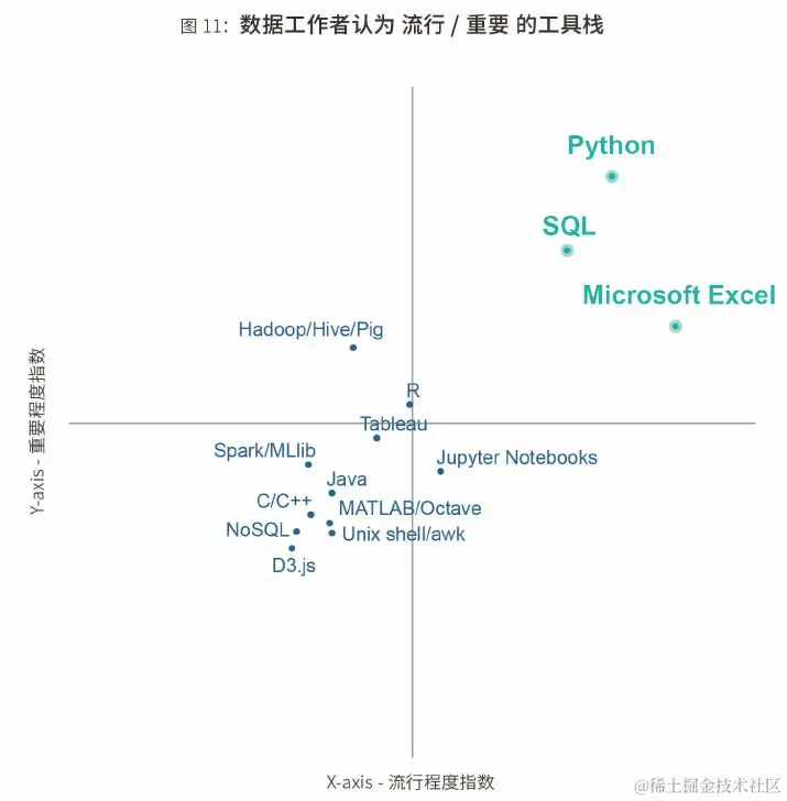 从工具的常见程度和重要程度对数据处理的各个工具栈进行调研,这些工具主要包括:Python、 SQL、 Excel、Hadoop/Hive/Pig、R、Jupyter Notebooks、Tableau、Spark/MLlib、Java等。