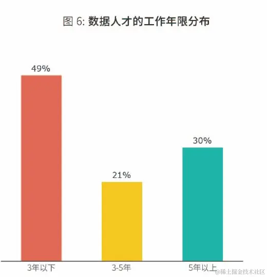从上图分布可以看出,有接近50%的人目前具有3年以下工作经验,从侧面反映出数据人才群体中职场新人居多;同时,有30%的人具备超过5年的工作经验,反映出目前数据人才中的另一主要人群来自于企业中传统岗位的人才转型。职场新人和企业内部转型员工是数据人才的主要来源
