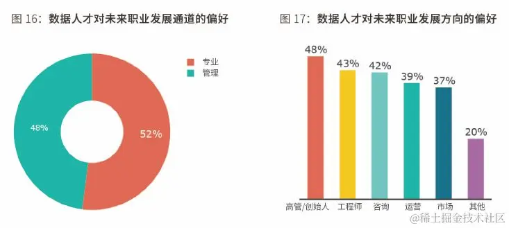 根据调研结果分析,有48%的数据人才未来期望成为高管/创始人,成为公司或团队的领头羊。有42%-43%的数据人才以工程师、咨询师作为自己的职业目标,依托精湛的技术获取自身满足感与事业成就感。相较于其他人才群体,数据人才对于未来的职业发展通道更偏好于走专业路线。