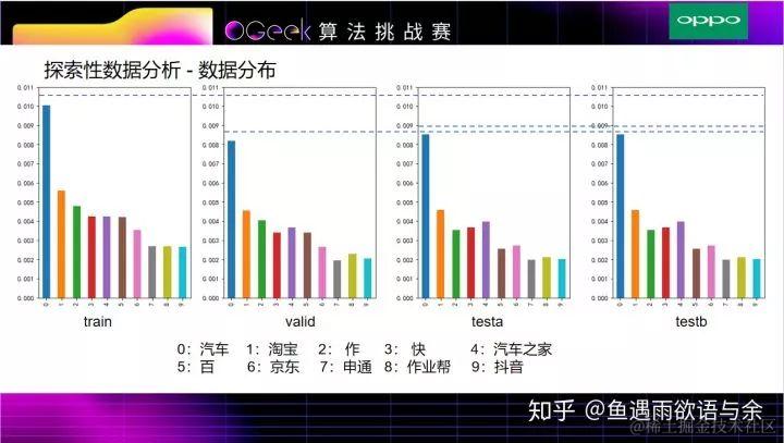 这四个图是prefix在各自数据集的百分比统计,并以训练集中出现频次top10的prefix画出了每个数据集的占比情况,可以发现valid与testa和testb的分布相似,说明valid与testa和testb的查询时间比较接近,作为验证集线下比较可信。