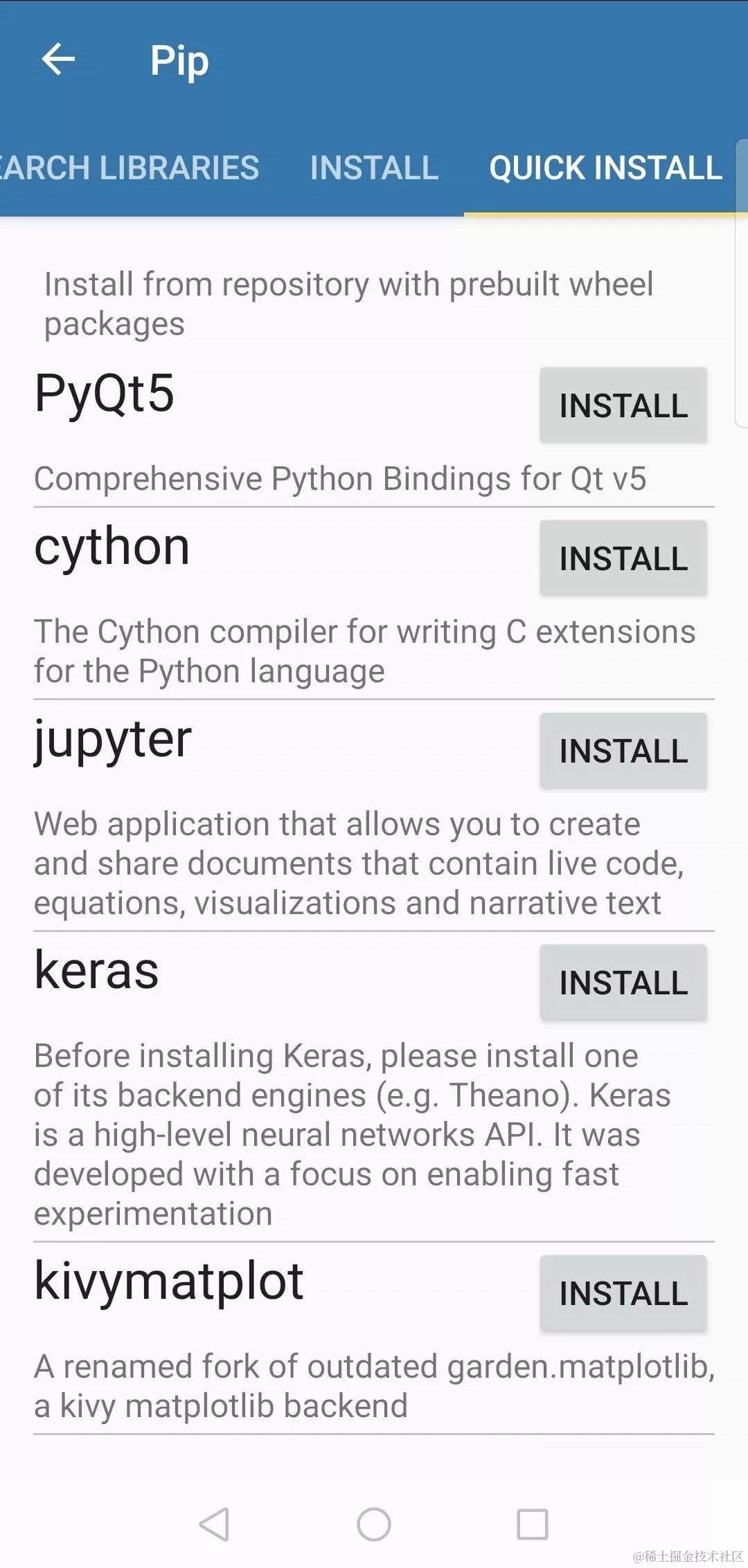 看到这里,童鞋们有没有心动呢?尤其是对于numpy,scipy,matplotlib,scikit-learn等科学库的支持,真的让小编很激动啊!下面小编会手把手教大家安装Pydroid 3,安装需要至少200MB的可用内存,如果你使用像scipy这样的重型库,请预留出更多的空间确保安装正常进行。