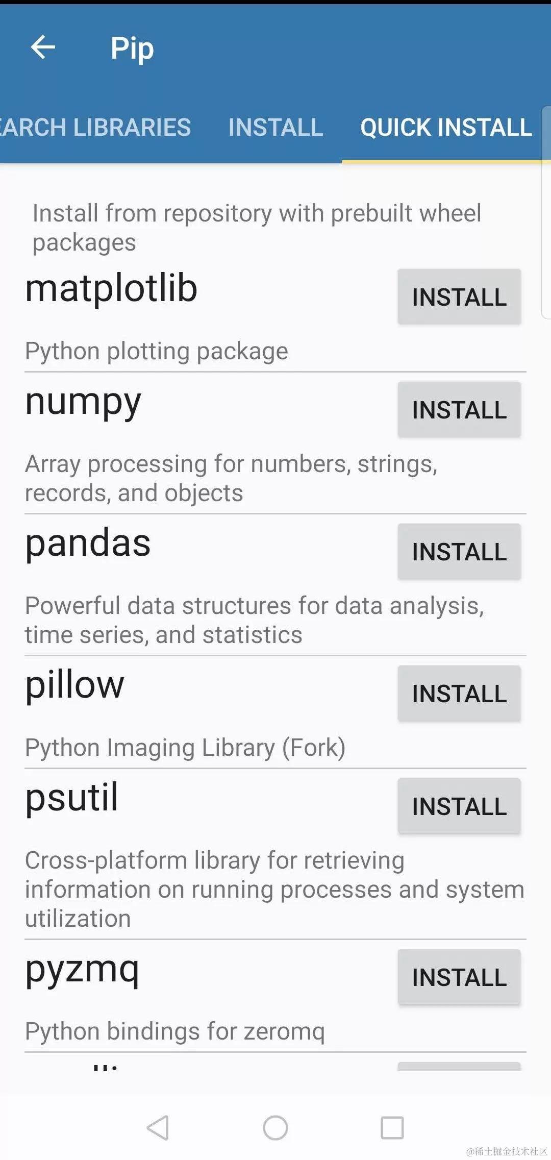 我们可以从google play 或者应用汇上面找到Pydroid 3,下载安装即可。由于使用google play 不方便,小编最后选择了应用汇进行下载,点击图标就可以开始使用啦,根据自己的需要可以选择pip各种库哦!结合手机浏览器,你还可以在安卓上拥有Jupyter notebook!快去下载试试吧!