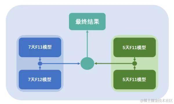 2.两组F11/F12模型都完成融合后,各得到长度22000条的最终结果,取出五天模型的TOP15000与七天模型进行融合并去重,得到最终结果。