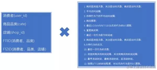 我们将问题二定义为预测用户ID+品类ID+店铺ID组合成的F12ID,在2018-04-16到2018-04-22是否发生购买行为的二分类问题。