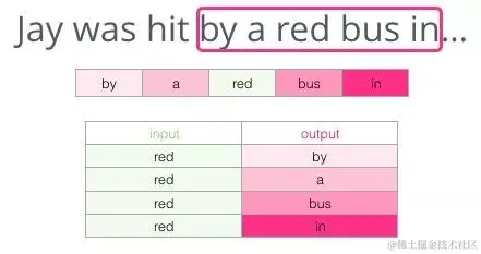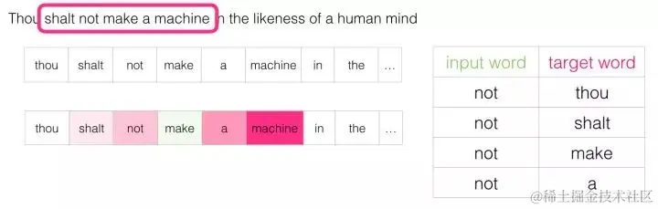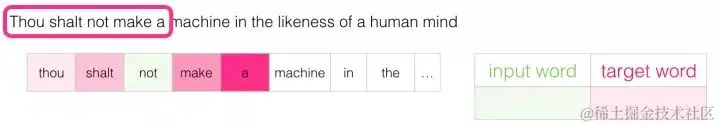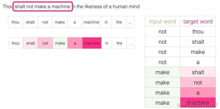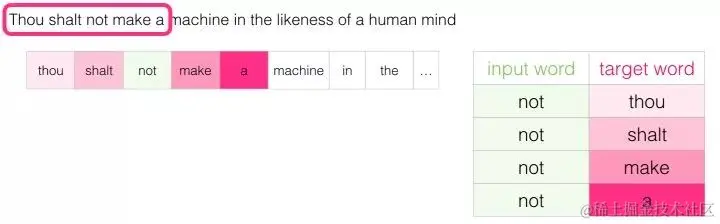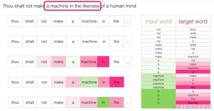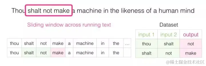 绿色框中的字将是输入字,每个粉色框将是可能的输出。 粉色框具有不同的阴影,因为此滑动窗口实际上在我们的训练数据集中创建了四个单独的样本: