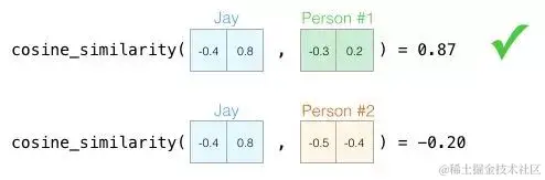 处理向量时,计算相似度得分的常用方法是余弦相似度: