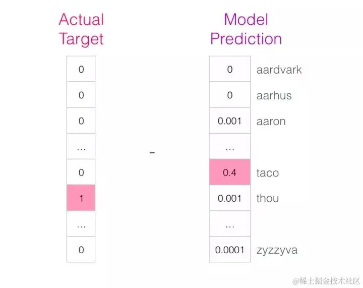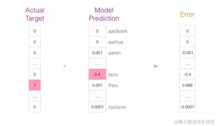 “目标向量”的词(字)概率为1,其他词(字)的概率都是0。 我们减去两个向量,得到一个误差向量: