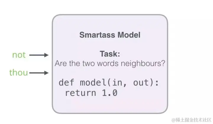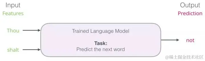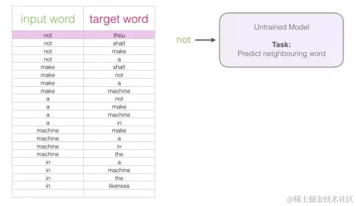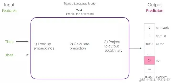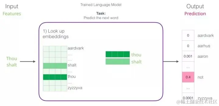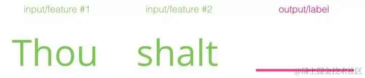在上面的屏幕截图中,我们可以将模型视为接受这两个绿色单词(thou shalt)并返回建议列表(“not”是具有最高概率的那个字)的模型: