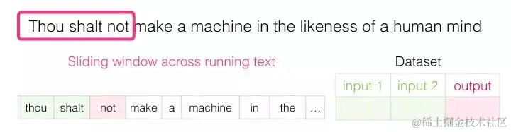 当这个窗口滑动文本时,我们(虚拟地)生成一个用于训练模型的数据集。为了准确看看它是如何完成的,让我们看看滑动窗口如何处理这个短语: