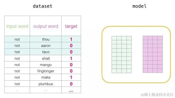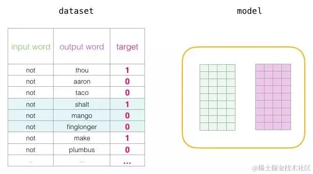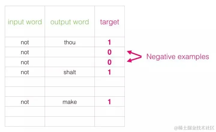 图:对于我们数据集中的每个样本,我们添加了负样本。它们具有相同的输入词和0标签。但是我们填写什么作为输出词?我们从词汇表中随机抽取单词