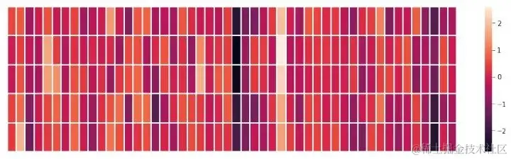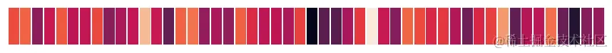 这是一个包含50个数字的列表,我们无法说清楚里面的值代表什么。我们把所有这些数字放在一行,以便我们可以比较其他单词向量。让我们根据它们的值对单元格进行颜色编码(如果它们接近2则为红色,如果它们接近0则为白色,如果它们接近-2则为蓝色)