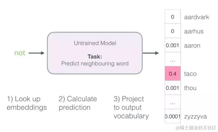 我们从数据集中的第一个样本开始。我们把特征提供给未经训练的模型,要求它预测一个合适的相邻单词。