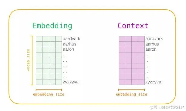 在训练过程开始之前,我们预先处理我们正在训练模型的文本。在这一步中,我们确定词汇量的大小(我们称之为vocab_size,比如说,将其视为10,000)以及哪些词属于它。在训练阶段的开始,我们创建两个矩阵 - Embedding矩阵和Context矩阵。这两个矩阵在我们的词汇表中嵌入了每个单词(这vocab_size是他们的维度之一)。第二个维度是我们希望每次嵌入的时间长度(embedding_size- 300是一个常见值,但我们在本文前面的例子是50。)。