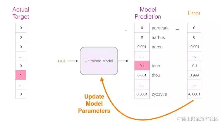 现在可以使用此误差向量来更新模型,以便下次当“not”作为输入时,模型更有可能猜测“thou”。