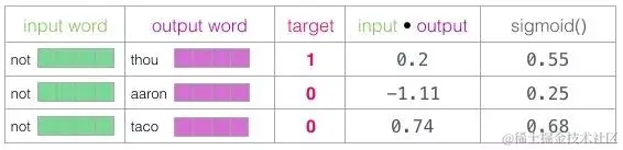 现在我们有四个单词:输入单词not和输出/上下文单词:( thou实际邻居),aaron,和taco(负样本)。我们继续查找它们的嵌入 - 对于输入词,我们查看Embedding矩阵。对于上下文单词,我们查看Context矩阵(即使两个矩阵都在我们的词汇表中嵌入了每个单词)。\