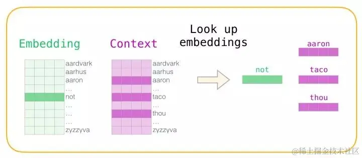 在讨论嵌入时,第一步对我们来说最相关。训练过程的结果之一是这个矩阵包含我们词汇表中每个单词的嵌入。在预测时间内,我们只查找输入字的嵌入,并使用它们来计算预测: