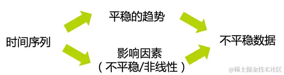 在理想情况下,同一周期(年份、月份、天)内统计指标的数值应该都是平稳、相近的。但在现实生活中我们统计指标的数值的观测值往往都是呈现出不平稳的状态。这是因为实际业务场景中,统计指标的数值会受到很多的外部影响因素的作用,最终导致了数据的不平稳,如下图所示。