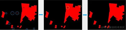 那么我要开始diss下自己了,当时的我其实对赛题并没有太过深入了解,直接将在2015和2017年遥感图像相同位置的图片crop出来,然后将差值图片当作输入。这样的做法会丢失掉特别多的信息,正确的做法是将2015年和2017年数据合并为8通道,再经过输入到神经网络进行训练。通过赛题理解以及数据分析,我们还能够发现很多小的trick,比如下图,如果能够设定阈值,去掉阈值较小的连通集和空洞,分数也会得到提升。