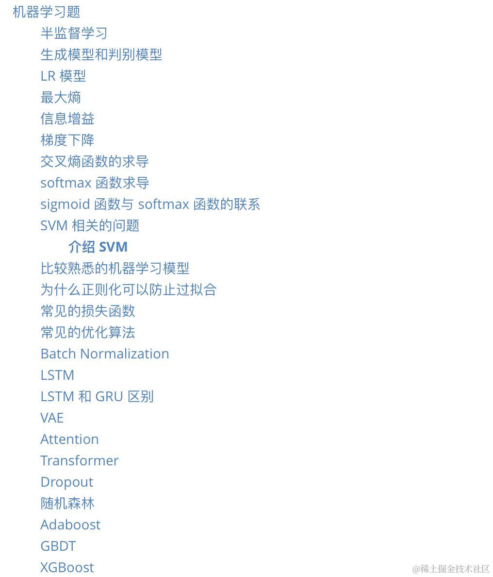 针对软算法,就在网络上搜索面经,例如牛客网、技术公众号、csdn等等,在面试相应的公司之前,先检索下该公司岗位常考察的算法题目。简历上提及的算法,例如LR、GBDT、CNN/RNN/LSTM,原理一定要懂,常考察的公式需要掌握推导流程,例如手写SVM推导、神经网络反向传播推导流程。以下是整理的一些机器学习面试资料目录,学习之后,面试时候就能和面试官斗智斗勇了。