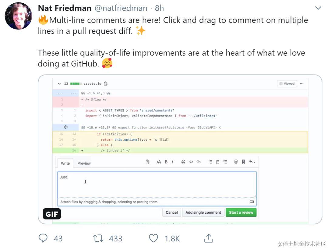 北京时间 2019 年 10 月 2 日,GitHub CEO Nat Friedman 在 Twitter 发布消息,宣布 GitHub pull request 正式支持 multi-line comments!