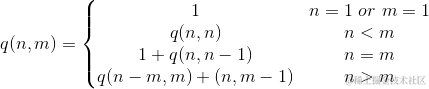 当 n=m 的时候,划分可以由 n_1 = n 的划分 和 n_1<=n-1 的划分组成 ,即q(n,m)=q(n,n)=1+q(n,n-1)