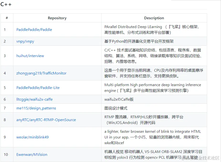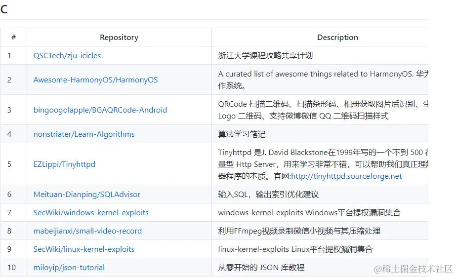 C++ 分榜也列举了 Top 200 项目,最高 star 有 10k。