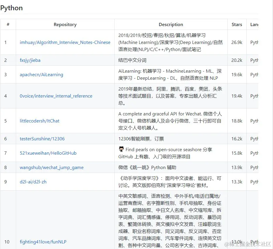 Python 分榜也列举了 Top 200 项目,最高 star 有 26.9k。\