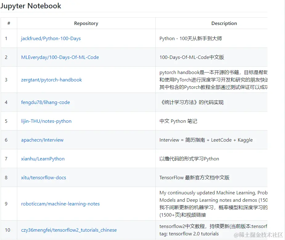 Jupyter Notebook 分榜也列举了 Top 200 项目,最高 star 有 62.6k。
