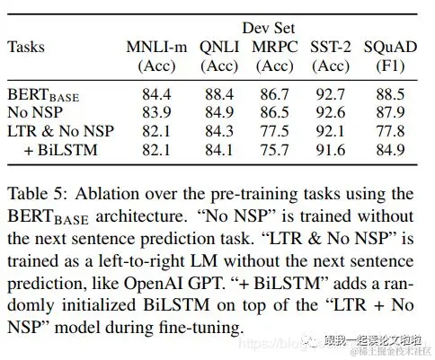实验部分是一片大好咯,各种牛逼。论文中也分析了不加 Masked LM 或不加 Next Sentence Prediction 预训练对模型结果的影响如下