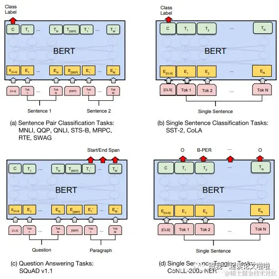 不同类型的任务需要对模型做不同的修改,但是修改都是非常简单的,最多加一层神经网络即可。如下图所示