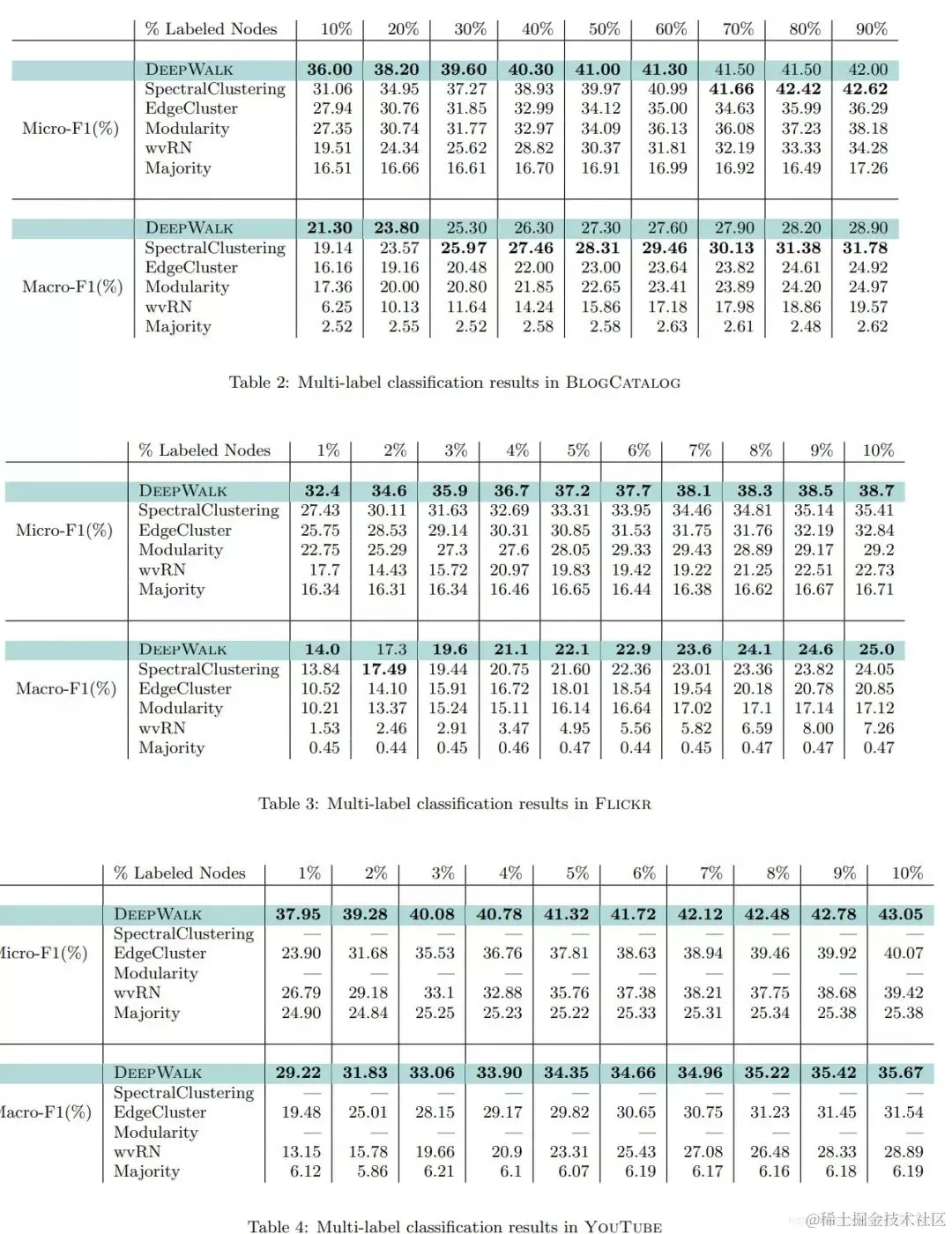论文实验中,随机抽取部分样本作为训练集(带 label),剩余的作为测试集,在训练集中,以上面所说的方式(DeepWalk+Skip-Gram+Hierarchical softmax)学习每个节点的表示向量,然后以学习到的表示向量作为特征,LR 分类器进行训练,训练出一个分类模型;再在测试集上进行测试。实验结果如下:可以看出当选取较少的带 label 训练数据时(label sparse),相对于其他方法,DeepWalk 的效果更好。