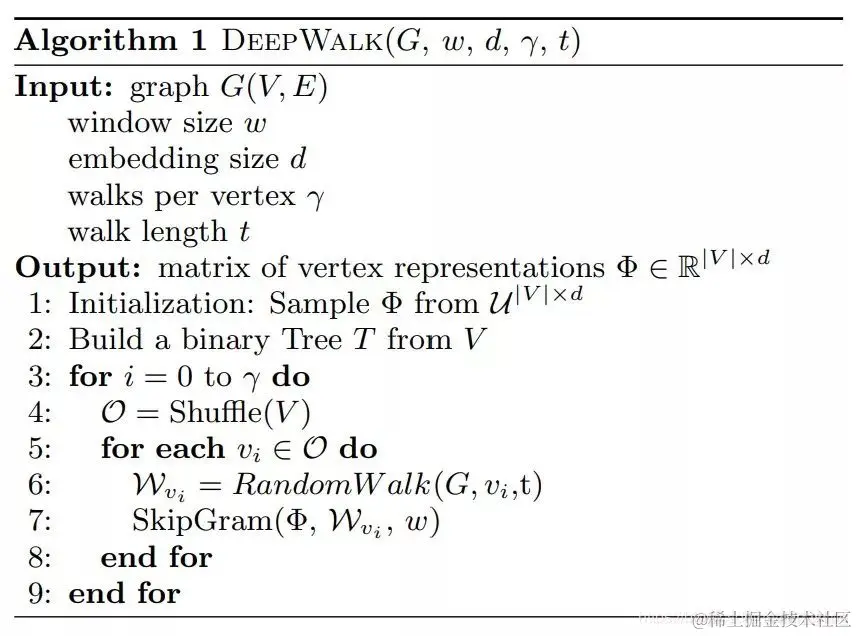- 那么在非语言结构的其他结构中,例如图结构中,是否可以根据图中节点与节点相邻关系,来学习每个节点的表示呢?显然是可以的,论文中提出,在图结构中,以任意一个节点为起始节点,进行随机游走,当游走到最长的步数时,可以获取一串由节点构成的序列,这个序列就可以类比自然语言中的句子,节点类比句子中的词,然后利用 word2vec 的方法对每个节点进行表示学习。