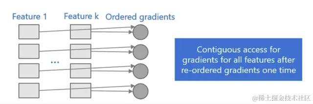 - 首先,所有的特征都采用相同的方法获得梯度(区别于不同特征通过不同的索引获得梯度),只需要对梯度进行排序并可实现连续访问,大大提高了缓存命中;