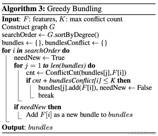 对于问题二:论文给出特征合并算法,其关键在于原始特征能从合并的特征中分离出来。假设 Bundle 中有两个特征值,A 取值为 [0, 10]、B 取值为 [0, 20],为了保证特征 A、B 的互斥性,我们可以给特征 B 添加一个偏移量转换为 [10, 30],Bundle 后的特征其取值为 [0, 30],这样便实现了特征合并。具体算法如下所示: