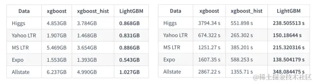 从 LightGBM 名字我们可以看出其是轻量级(Light)的梯度提升机(GBM),其相对 XGBoost 具有训练速度快、内存占用低的特点。下图分别显示了 XGBoost、XGBoost_hist(利用梯度直方图的 XGBoost) 和 LightGBM 三者之间针对不同数据集情况下的内存和训练时间的对比: