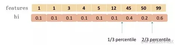 事实上, XGBoost 不是简单地按照样本个数进行分位,而是以二阶导数值 作为样本的权重进行划分,如下: