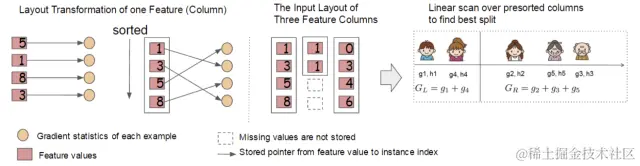 - 针对每个特征,把属于该节点的训练样本根据该特征值进行升序排列,通过线性扫描的方式来决定该特征的最佳分裂点,并记录该特征的分裂收益;