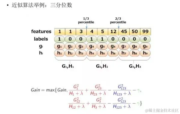 根据样本特征进行排序,然后基于分位数进行划分,并统计三个桶内的 G,H 值,最终求解节点划分的增益。