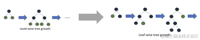 - Leaf-wise:每次分裂增益最大的叶子节点,直到达到停止条件。
