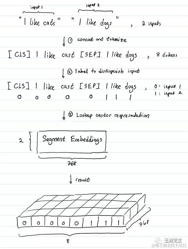 例如发布在 2019 年 2 月 “How the Embedding Layers in BERT Were Implemented”一文中的这张手绘图形,就把 BERT 为什么使用3种不同的嵌入层,讲得一清二楚。
