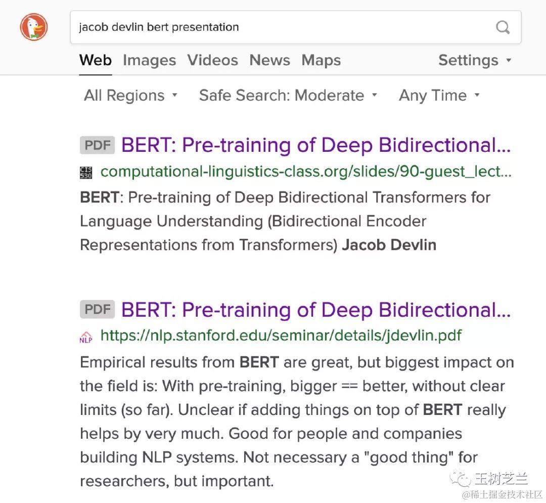 例如说,你在搜索引擎里面搜索 BERT 那篇论文的第一作者,加上 BERT 这个关键词,以及把资源类型指定为 ppt 之后,你就能看见很有趣的搜索结果了。